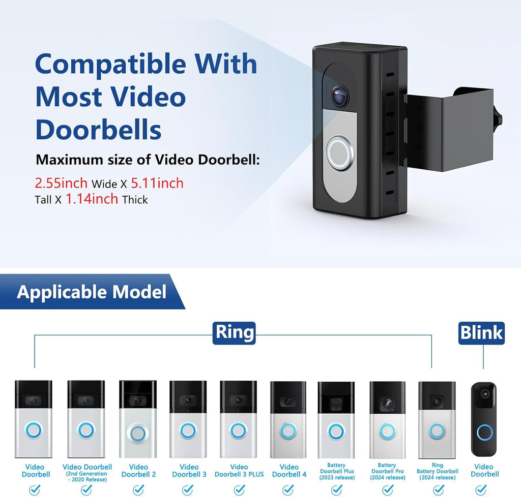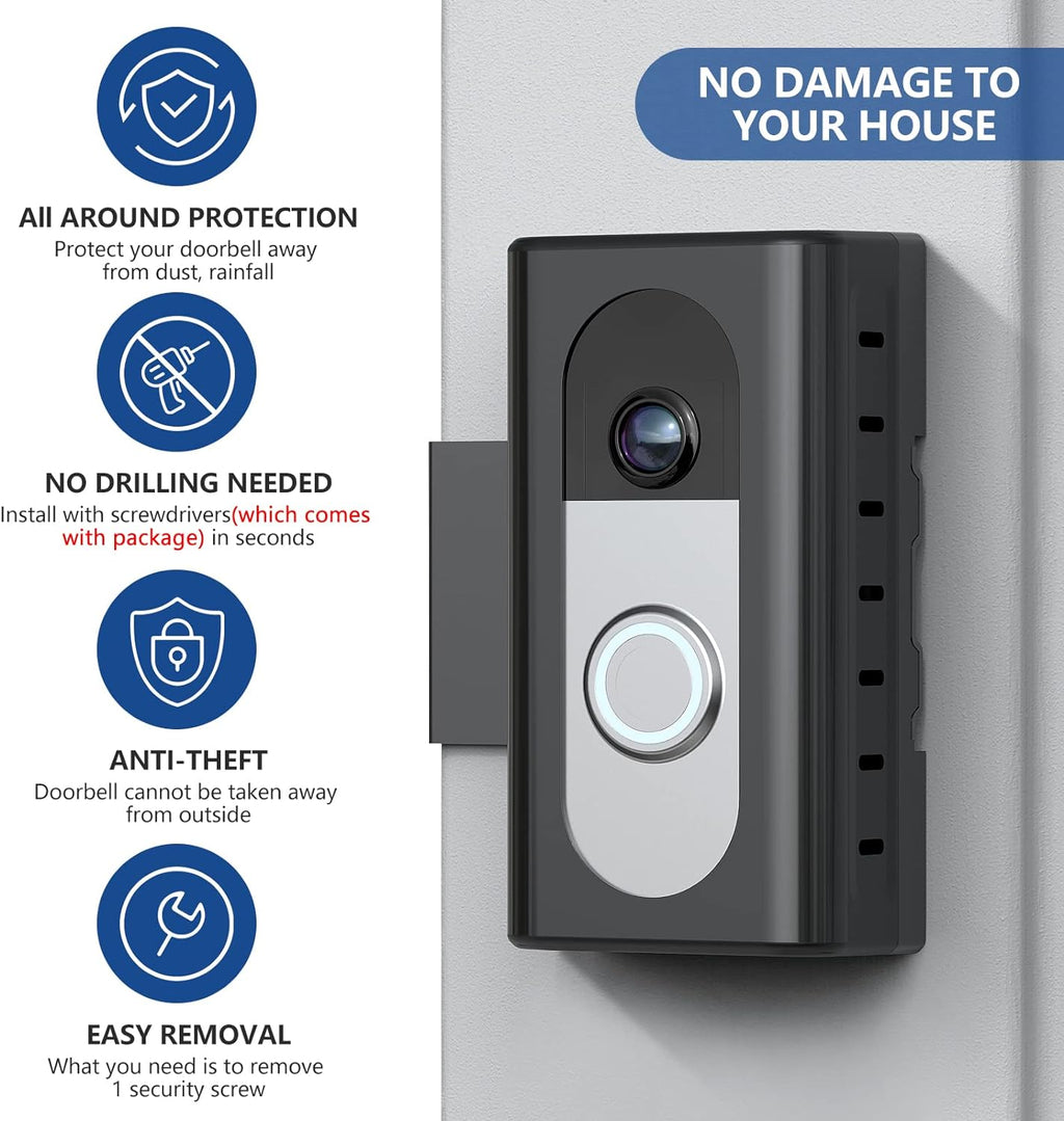 Protege tu timbre de video y mantén tu hogar seguro con el soporte de timbre de video antirrobo KIMILAR, diseñado para ser compatible con timbres inalámbricos Ring y Blink. Su sistema de montaje ajustable permite una instalación sencilla y firme sin necesidad de perforaciones, ideal para casas, apartamentos y negocios. Brinda protección contra robos y estabilidad para obtener el mejor ángulo de visión sin comprometer la seguridad de tu dispositivo.