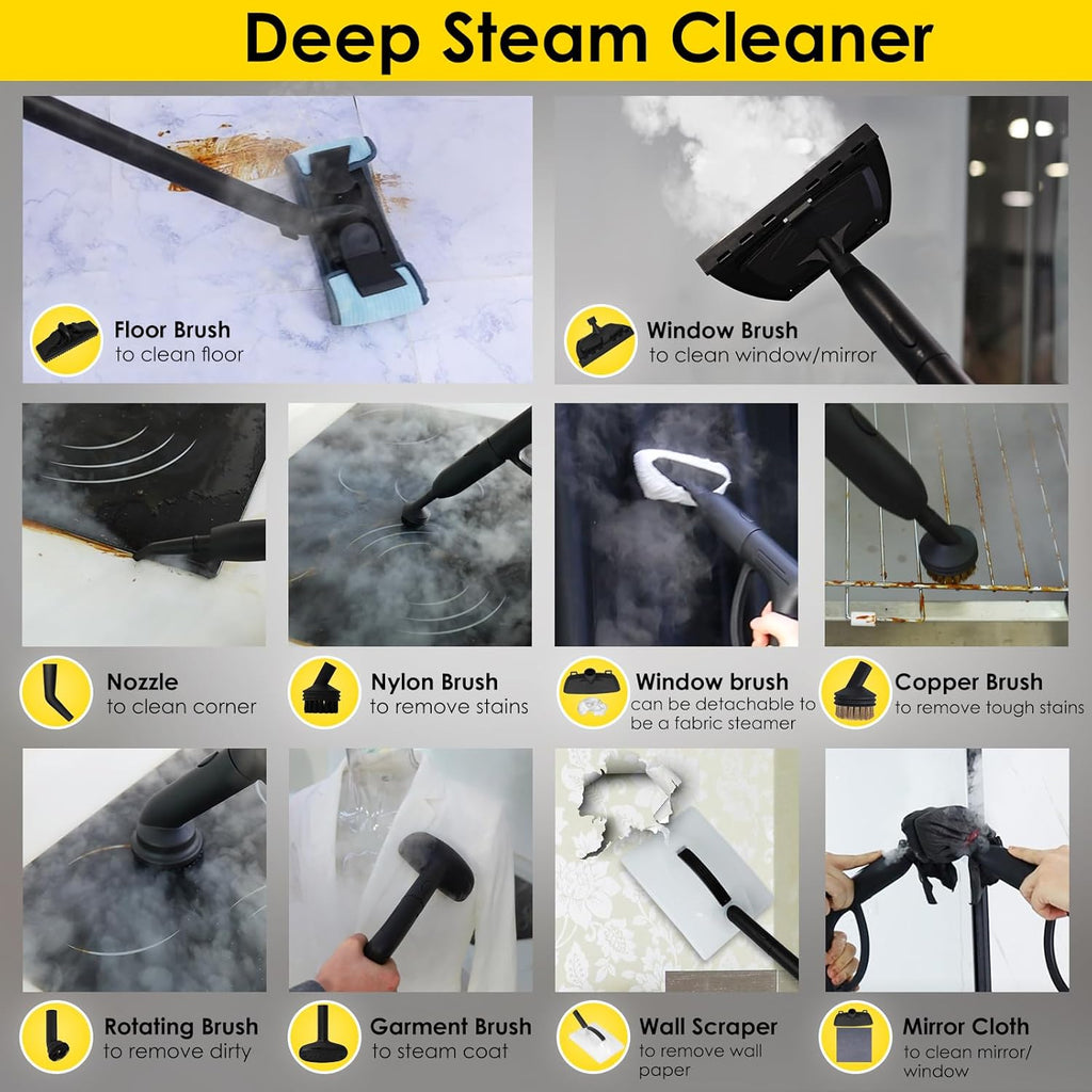 Descubre el poder del Limpiador de Vapor Profundo de 1500W, una herramienta versátil y eficaz que deja tus superficies impecables sin necesidad de productos químicos agresivos. Con su diseño portátil y múltiples accesorios, es ideal para limpiar desde tapicería hasta azulejos, alfombras y más.