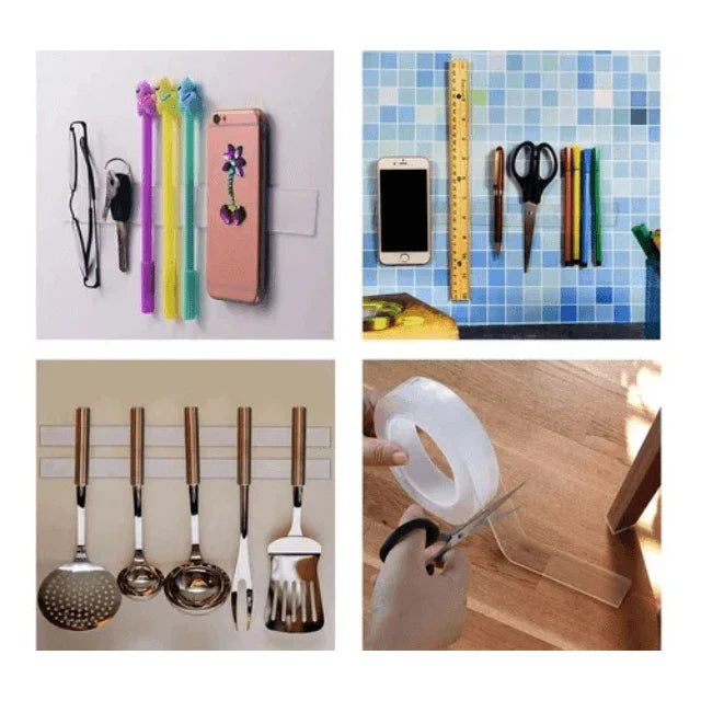 Con nuestra cinta doble faz ultra resistente puedes colgar cuadros, organizar cables, fijar objetos y decorar sin perforaciones. Se adhiere a cualquier superficie como vidrio, madera, cerámica y más, sin dejar rastros.